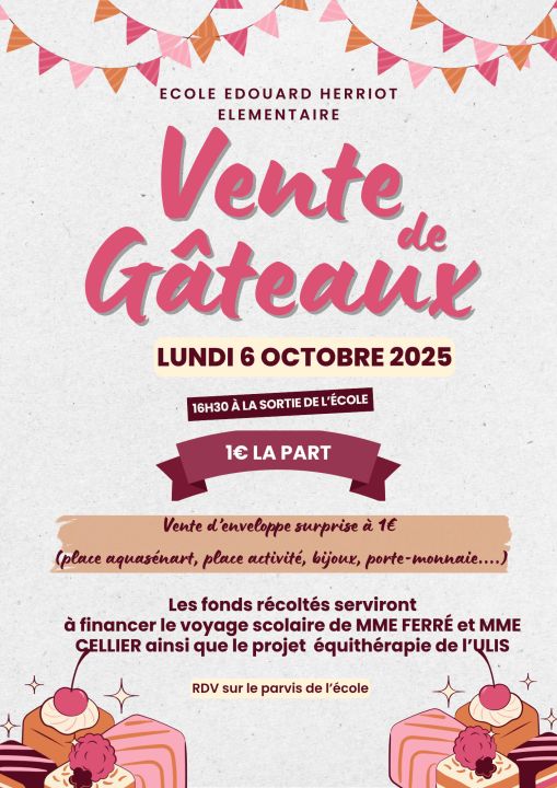 Nous organisons une vente de gâteaux et enveloppe surprise, lundi 6 octobre à 16h30 devant l'école, afin de financer le projet de voyage scolaire de Mme Ferré, Mr Sall et Mme Cellier et le projet d'équithérapie de l'ULIS.